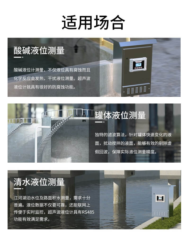 超声波液位计(测量液位/物位),是一种非接触式、高可靠性、高 性价比、易安装维护的液位/物位测量仪器。它不需接触被测量介质就能 满足大部分液位/物位测量要求,是本公司具有完全自主产权的新一代超声波液位计。